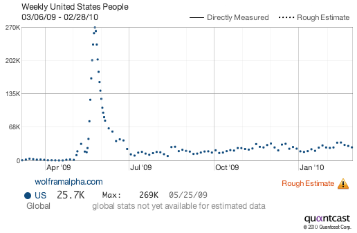 I guess it should be taken with a grain of salt but, Wolfram Alpha itself reports 480k daily visitors [1]. Though the graph [2] roughly matches your graph.