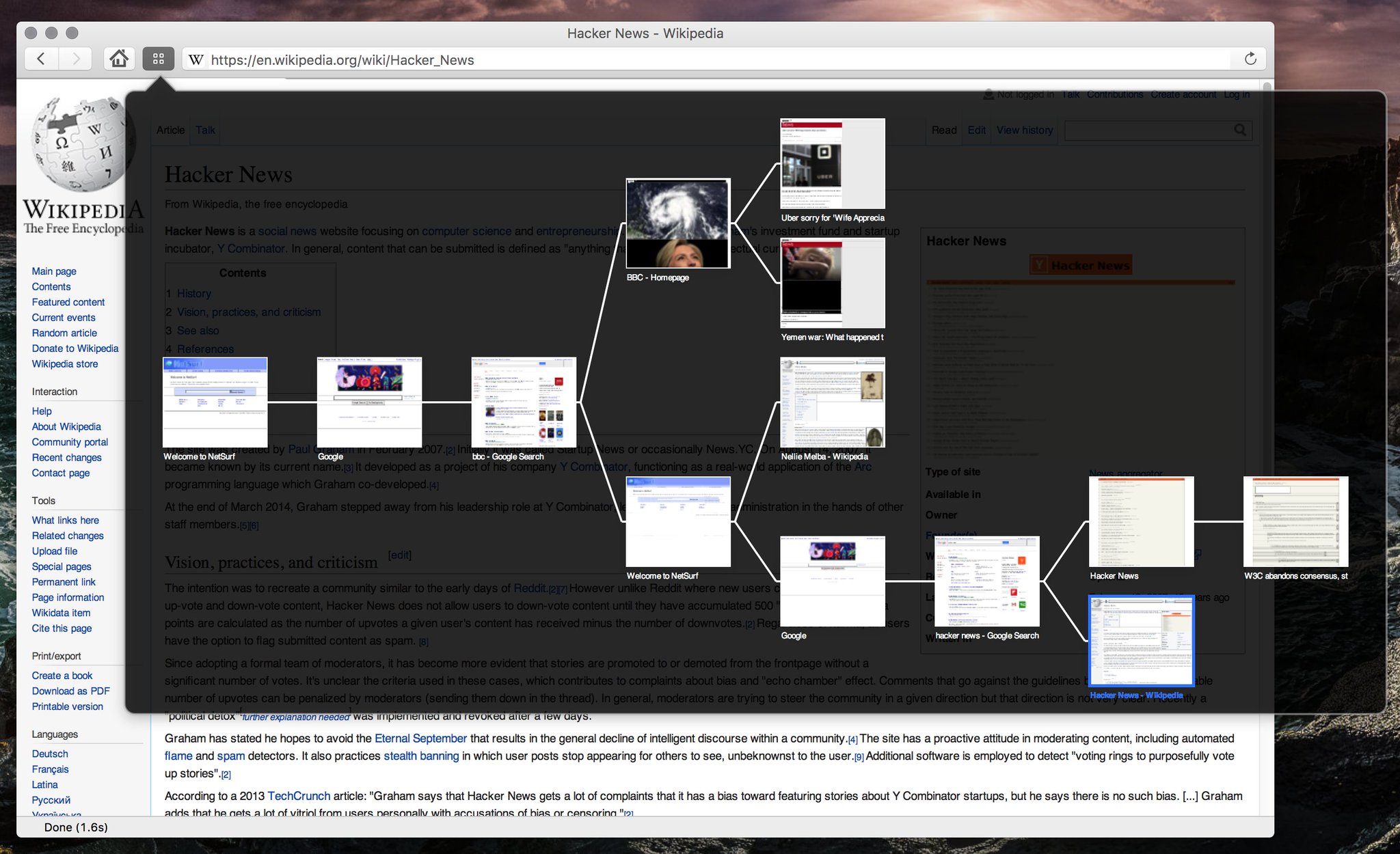 That's it. Hierarchical pages makes it really easy to contextually browse or what I call "immutable browsing" which is never just clicking, but always ctrl+clicking links to never change your current page.